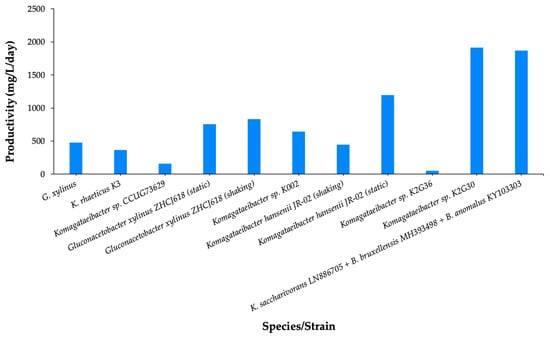 Productivity of bacterial cellulose by SCOBY-derived strains, according to data found in the selected articles [,,,,,,,,] related to the isolation of microbial strains from Kombucha derived SCOBY.