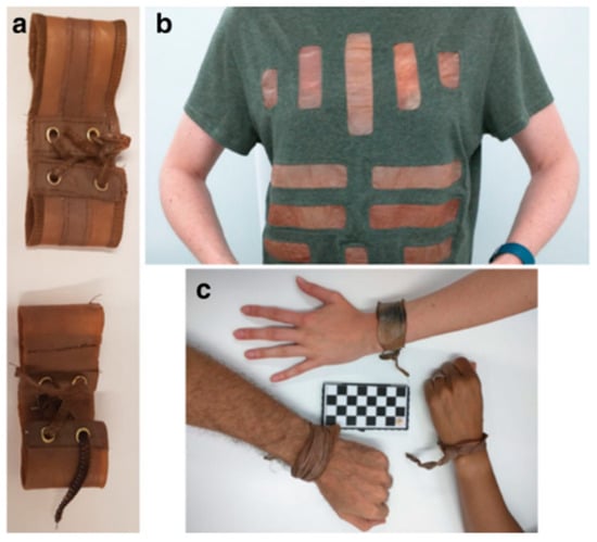 Photographs of the wristband, day 1 (a) and day 7 (c). T-shirt with sewn in cellulose-based coated fabric (b). Reproduced from Kaminski et al. [], under the terms of the Creative Commons CC BY license (https://creativecommons.org/licenses/by/4.0/).