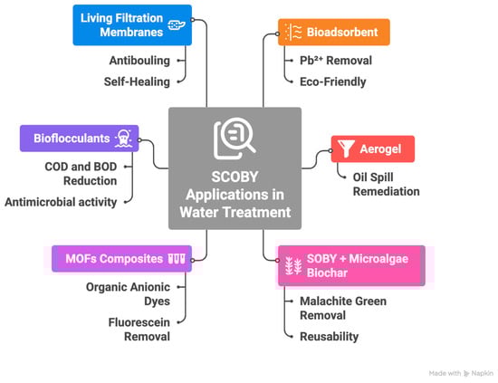 The growing scarcity of potable water and the presence of toxic contaminants represent critical challenges to public health and environmental sustainability. In this context, 8 papers [,,,,,] evidence SCOBY as a promising material for key technologies traditionally developed from polymeric compounds, representing 6.8% of the 117 articles analyzed. Within this group, the highest InOrdinatio score is 84 [], while the minimum is 43 []. SCOBY-derived bacterial cellulose has shown great potential in water treatment due to its eco-friendly and circular economy characteristics. Applications include aerogels for oil spill remediation, highly efficient bioadsorbents for heavy metals and dyes, and biochars produced with microalgae for pollutant removal. Functional composites, such as those with UiO-66 particles, further enhance dye adsorption, while bioflocculants from SCOBY-associated yeasts reduce COD and BOD and can generate antimicrobial nanoparticles. Additionally, living filtration membranes (LFMs) exhibit high efficiency in removing nanometric particles, self-healing capacity, antibacterial activity, and reduced biofouling compared to synthetic membranes, highlighting their promise for sustainable wastewater treatment [,,,,,,,]. In summary, the integration of sustainable technologies—including in situ SCOBY, SCOBY-derived biochar combined with microalgae, MOF-based adsorption, bioflocculation, and living filtration membranes—offers a promising strategy to tackle complex challenges such as pollutant toxicity, environmental degradation, and limited access to clean water (Figure 12).