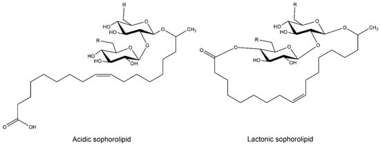 Sophorolipids consist of a hydrophobic hydroxylated fatty acid chain and a hydrophilic head formed by a disaccharide (sophorose). The fatty acid chain can be attached at one or two points to the sophorose molecule, giving rise to acidic and lactonic sophorolipids [57]. Figure 2 shows the structure of typical acidic and lactonic sophorolipids.