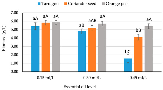 The effect of EOS × EOL interaction on biomass amount (g/L). (a,b: Different lowercase letters indicate significant differences between the essential oil levels in same essential oil source. A–C: Different capital letters indicate significant differences between the essential oil sources in same essential oil level).