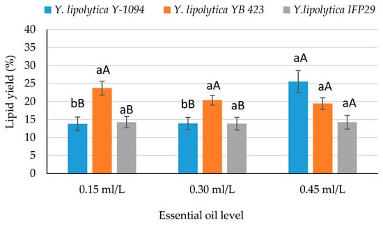 The effect of S × EOL interaction on lipid yield. (a,b: Different lowercase letters indicate significant differences between the essential oil levels in same strain. A,B: Different capital letters indicate significant differences between the strains in same essential oil level).