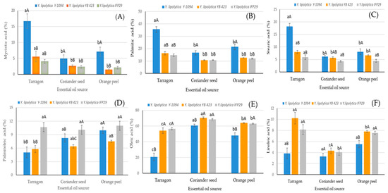 The effects of interactions of S × EOS on myristic (A), palmitic (B), stearic (C), palmitoleic (D), oleic (E) and linoleic (F) acids. (a–c: Different lowercase letters indicate significant differences between the essential oil sources in the same strain. A–C: Different capital letters indicate significant differences between the different strains in the same essential oil source).
