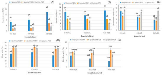 The interactions of S × EOL on myristic, palmitoleic, stearic, oleic and linoleic acids are given in Figure 6A–E. Increasing the essential oil level added to the medium from 0.15 mL/L to 0.45 mL/L caused an increase in the myristic acid value of Y. lipolytica YB 423. However, the highest myristic acid value was detected in Y. lipolytica Y-1094 at all essential oil levels (Figure 6A). The highest mean stearic acid value was also detected in Y. lipolytica Y-1094 at all essential oil levels. However, the stearic acid production of the strains was not dependent on the essential oil usage level. Furthermore, Y. lipolytica IFP29 gave higher mean values at all levels. This strain was not affected by the usage level (Figure 6B). On the other hand, as the level of essential oil added to the medium increased, the palmitoleic acid content of Y. lipolytica Y-1094 decreased. Similarly, when the essential oil level increased from 0.15 to 0.45 mL/L, the palmitoleic acid value of Y. lipolytica YB 423 decreased. The palmitoleic acid value of Y. lipolytica IFP29 was not affected by the increase in essential oil level (Figure 6C). The strains did not show any change in oleic acid levels depending on the oil concentration. Y. lipolytica Y-1094 gave a lower average oleic acid value at all three oil concentration levels (Figure 6D). On the other hand, oil level did not have a significant effect on the linoleic acid content of Y. lipolytica YB 423 and Y. lipolytica IFP29. The lowest average linoleic acid value was found in Y. lipolytica Y-1094 at 0.15 mL/L of essential oil level, and linoleic acid value decreased at the 0.45 mL/L of essential oil (Figure 6E). Similarly, in the study conducted by Chatzifragkou et al. [19], it was reported that the use of thyme (Origanum vulgare L.) essential oil above 0.15 mL/L increased the palmitic acid (C16:0) production capacity of Y. lipolytica, while decreasing the amounts of linoleic (C18:2) and palmitoleic (C16:1) acids. In addition, Papanikolaou et al. [18] reported that medium-chain saturated fatty acids increased in the fatty acid composition of Y. lipolytica in the presence of orange peel essential oil and this increase was dependent on the essential oil concentration. It has also been determined in other studies that different types and concentrations of essential oils significantly alter the ΣC18/ΣC16, C18:1/C18:0 and C18:2/C18:1 ratios and oleic, linoleic and stearic acid levels in microorganisms [34,36,37]. These findings suggest that different concentrations of essential oils can direct the saturated and unsaturated fatty acid profiles depending on the microorganism strain.