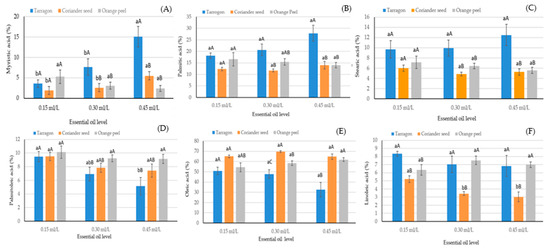 The effects of interactions of EOS × EOL on myristic (A), palmitic (B), stearic (C), palmitoleic (D), oleic (E) and linoleic (F) acids. (a,b: Different lowercase letters indicate significant differences between the different essential oil levels in the same essential oil source. A–C: Different capital letters indicate significant differences between the different essential oil sources in the same essential oil level).