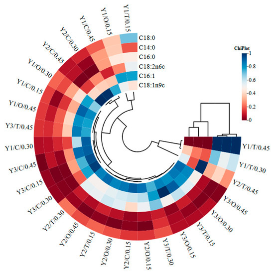 The experiment used a completely randomized design with three replicates per treatment. Data were analysed by one-way ANOVA; significant effects and interactions were followed by Duncan’s multiple range test (p < 0.05). For ANOVA analyses, significant differences were considered at p < 0.05, while highly significant differences were evaluated at p < 0.01. All statistical analyses were performed using SPSS version 20 statistical software. In addition, to determine relationship between factors and biomass, lipid content and lipid yield, and between the factors and fatty acid composition, the correlation heat map was carried out using ChiPlot [24].
