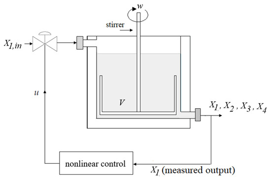 From the above, the relevance of closed-loop control of biochemical reactors has increased in recent years, under this frame, regulatory control is the main strategy to reach the basic operational requirements, for this reason, the new feedback control designs are an important research topic in industrial and academic areas [9,10]. Regulatory control has been performed via classical proportional–integral–derivative (PID) feedback controllers, considering the ease of its practical implementation and satisfactory performance under common industrial practice [11,12]; however, high disturbances and nonlinear behaviors can lead to unstable closed-loop operations [13]. From the above, other feedback controllers have been proposed to improve the dynamic performance of the chemical reactor, between them, the adaptive controllers which can modify some parameters in the control’s structure to keep satisfactory process operation [14,15], and some robust controllers designed against input disturbances and noisy measurements have been presented in the open literature over several years, under the frameworks of sliding-mode theory, observed-based I/O linearizing controllers, and optimal controllers, etc. [16,17]. In particular, a model based adaptative control for the fermentation of milk in batch bioreactors has been addressed in [18] and a method for globally stabilizing the control of a continuous ethanol fermentation process, initiating from batch production mode, is presented in [19].
