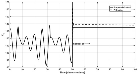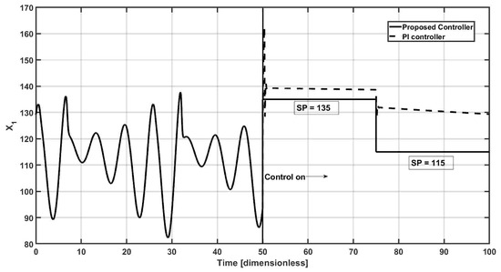 Therefore, a closed-loop strategy must be implemented to avoid the bioreactor’s oscillatory dynamic behavior; the proposed controller turns up at t = 50 time units, as observed in Figure 2, and the proposed controller leads the controlled concentration x1 to the required reference point x1,sp = 135, almost immediately with a small overshoot and null settling time, without offset, here for comparative purposes a standard proportional–integral (PI) controller is also implemented. Proportional–integral (PI) controllers are widely applied in fermentation processes due to their simplicity and effectiveness in managing slow and nonlinear dynamics regularly found in bioreactors. The performance of PI controllers in fermentation is generally characterized by stable tracking of setpoints and rejection of disturbances, particularly in the presence of moderate process nonlinearity [36].