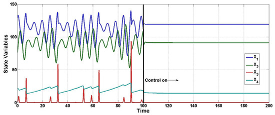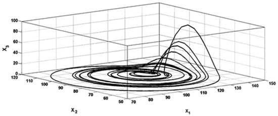 With the following set of initial conditions and parameter values, system (1)–(4) exhibits chaotic behavior. The values of the kinetic parameters are fixed as the following: k1 = k2 = k3 = 1, k4 = 0.25, k5 = 152.5, k6 = 1, k7 = 130, k8 = 0.001, k9 = 1, k10 = 1.051, k11 = 0.5, and K = 0.001. The constant disturbances are d0 = 90 and d1 = 2.2. The initial conditions are chosen as follows: 129.1, 76.06, 0.5895, and 21.38. The inlet concentrations to the reactor are , , and the nominal value of the control input is considered as u = 0.015. In the numerical experiments of Section 4, it will be assumed that the mass concentration, , is obtained by measurement and it is available for feedback; therefore, will be used to implement the nonlinear control.