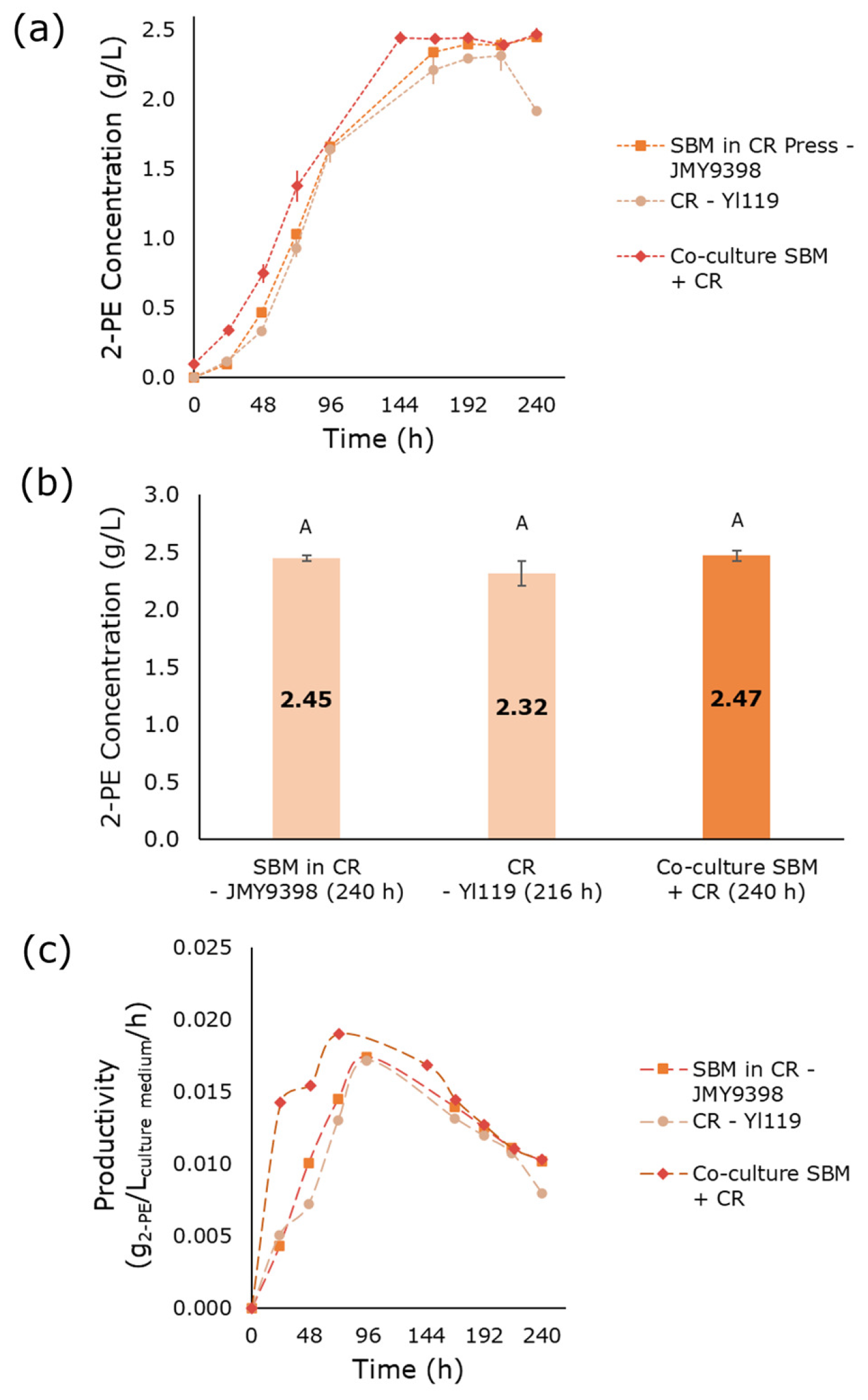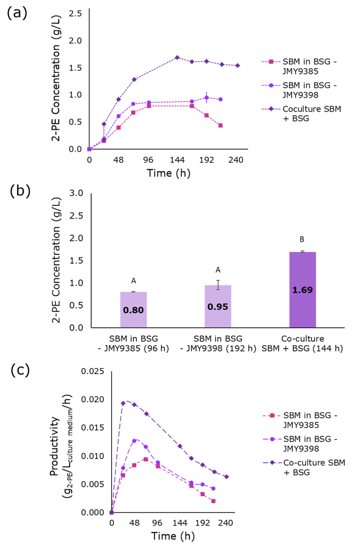 | Preculture 44.14 g/L SBM diluted in BSG—JMY9398 | Preculture 44.14 g/L SBM diluted in BSG—JMY9385 | Preculture BSG pressing extract—JMY9385 | Preculture CR pressing extract—Yl119 | Preculture 44.14 g/L SBM diluted in CR pressing extract—JMY9398 | Preculture CR pressing extract—Yl119 | Preculture 44.14 g/L SBM diluted in CR/BSG pressing extract—JMY9398 | Preculture CR pressing extract—Yl119 | Preculture BSG pressing extract—JMY9385 |