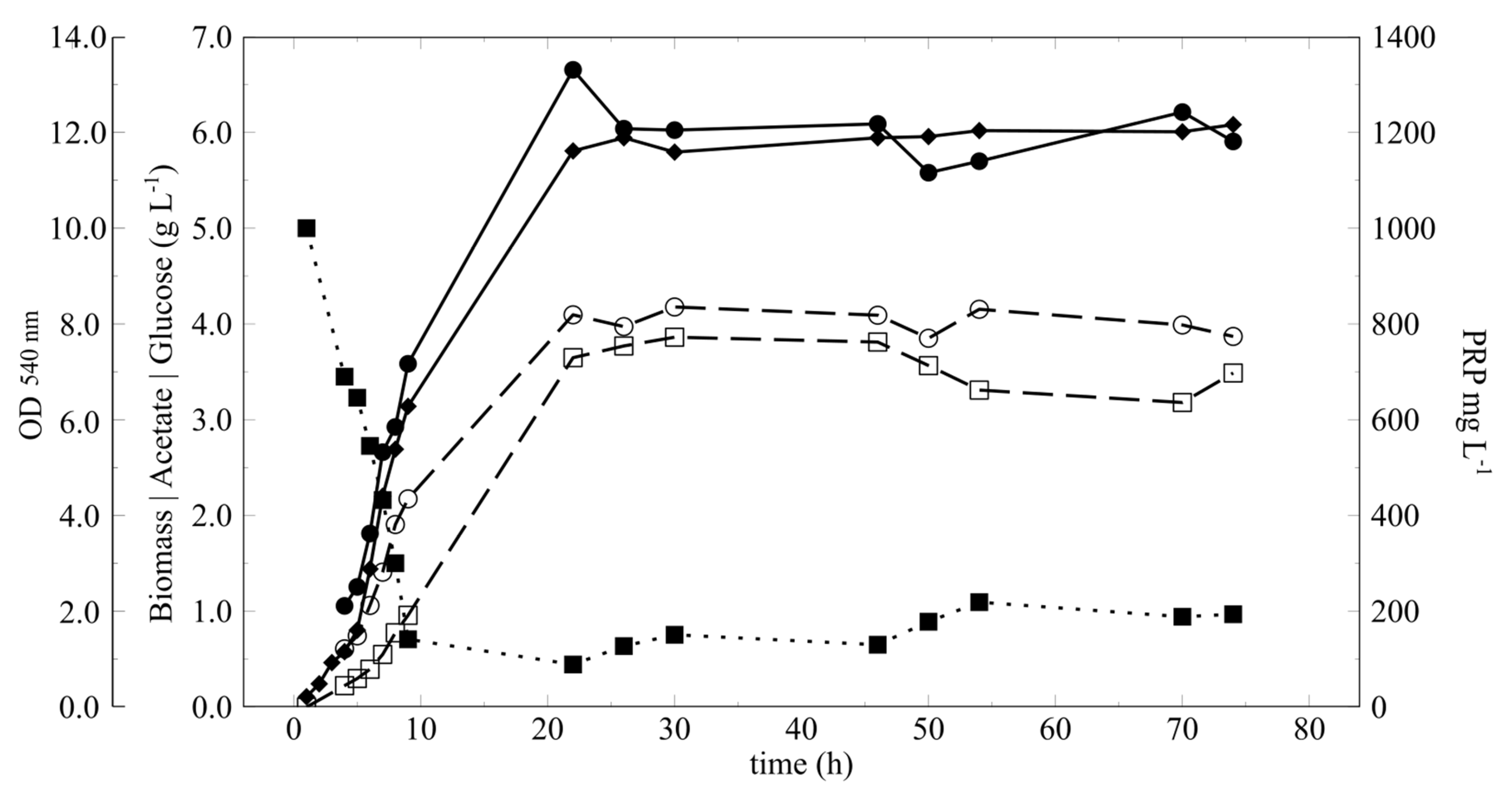| Qpacetate (g L−1 h−1) | 0.25 ± 0.03 | 0.93 ± 0.02 |
