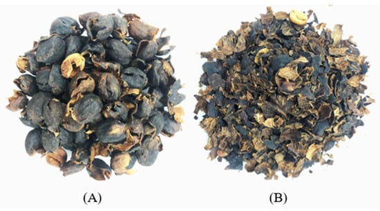 Appearance of dried coffee (Coffea arabica L.) cherry husks (A) before and (B) after size reduction.