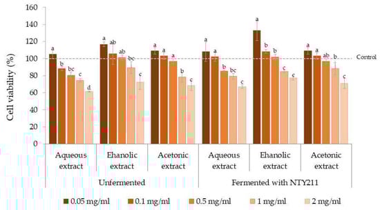 Cell viability of unfermented and NTY211-fermented coffee cherry husks extracted using different solvents. Different lowercase letters indicate significant differences (p < 0.05) within the same extract.