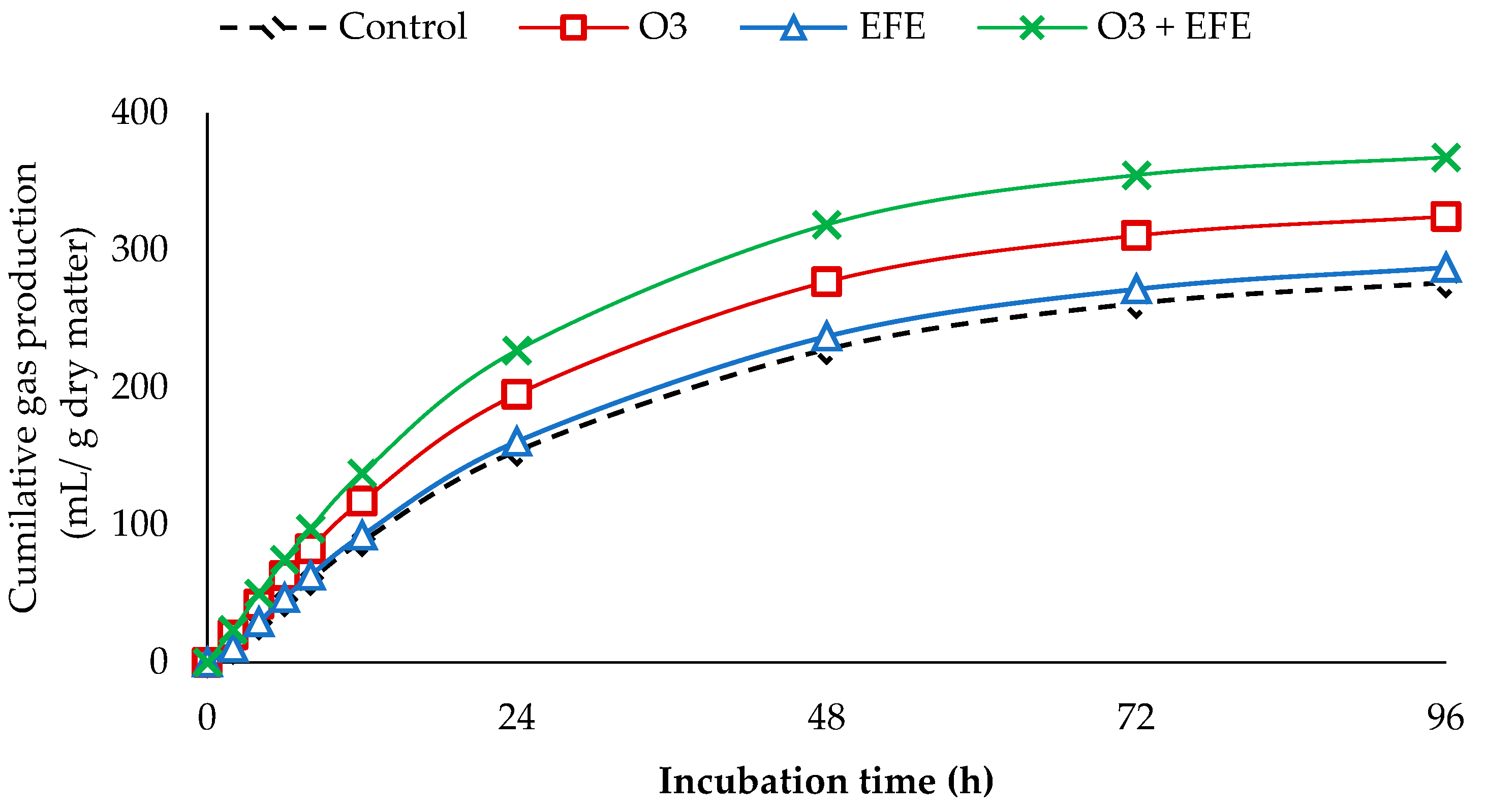 - Maheri-Sis, N.; Esmaeili-Marchubeh, M.K.; Aghajanzadeh-Golshani, A.; Safaei, A.R.; Tavakkoly-Moghaddam, B. Evaluating the Effects of Ozonation Pretreatment on Ruminal Fermentation Kinetics and Nutritive Value of Wheat Straw Using in Vitro Techniques. Indian J. Anim. Sci. 2025, 95, 251–256. [Google Scholar] [CrossRef]
