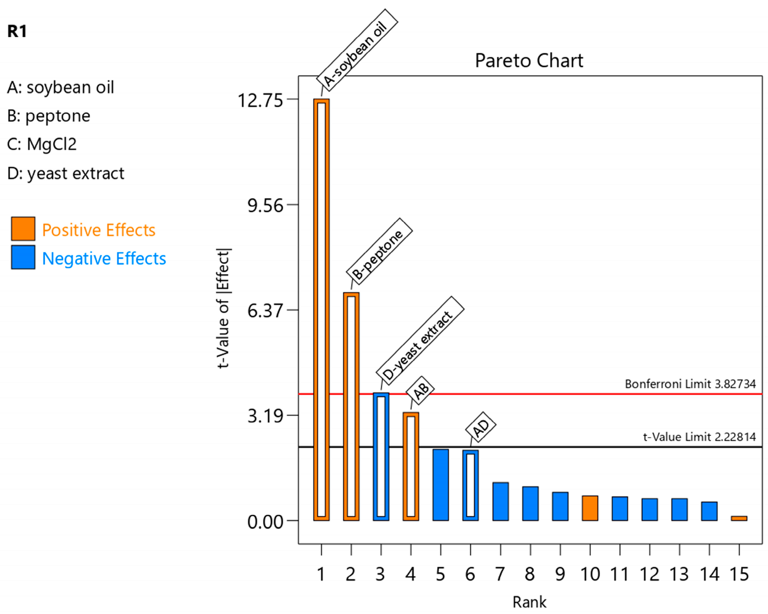 | A-Peptone (g/L) | B-Yeast Extract (g/L) | C-Soybean Oil (mL/L) | |