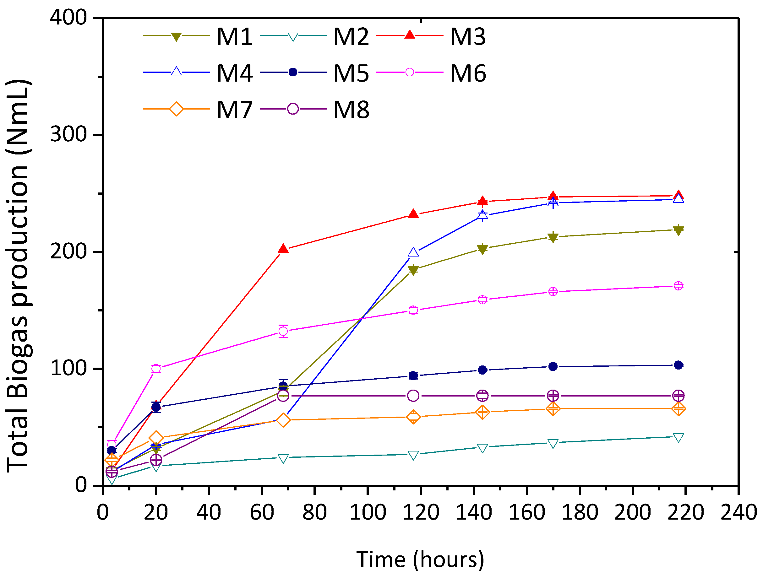 | Total Biogas production (NmL) | 219.0 | 42.0 | 248.0 | 245.0 | 103.0 | 171.0 | 66.0 | 77.0 | |
