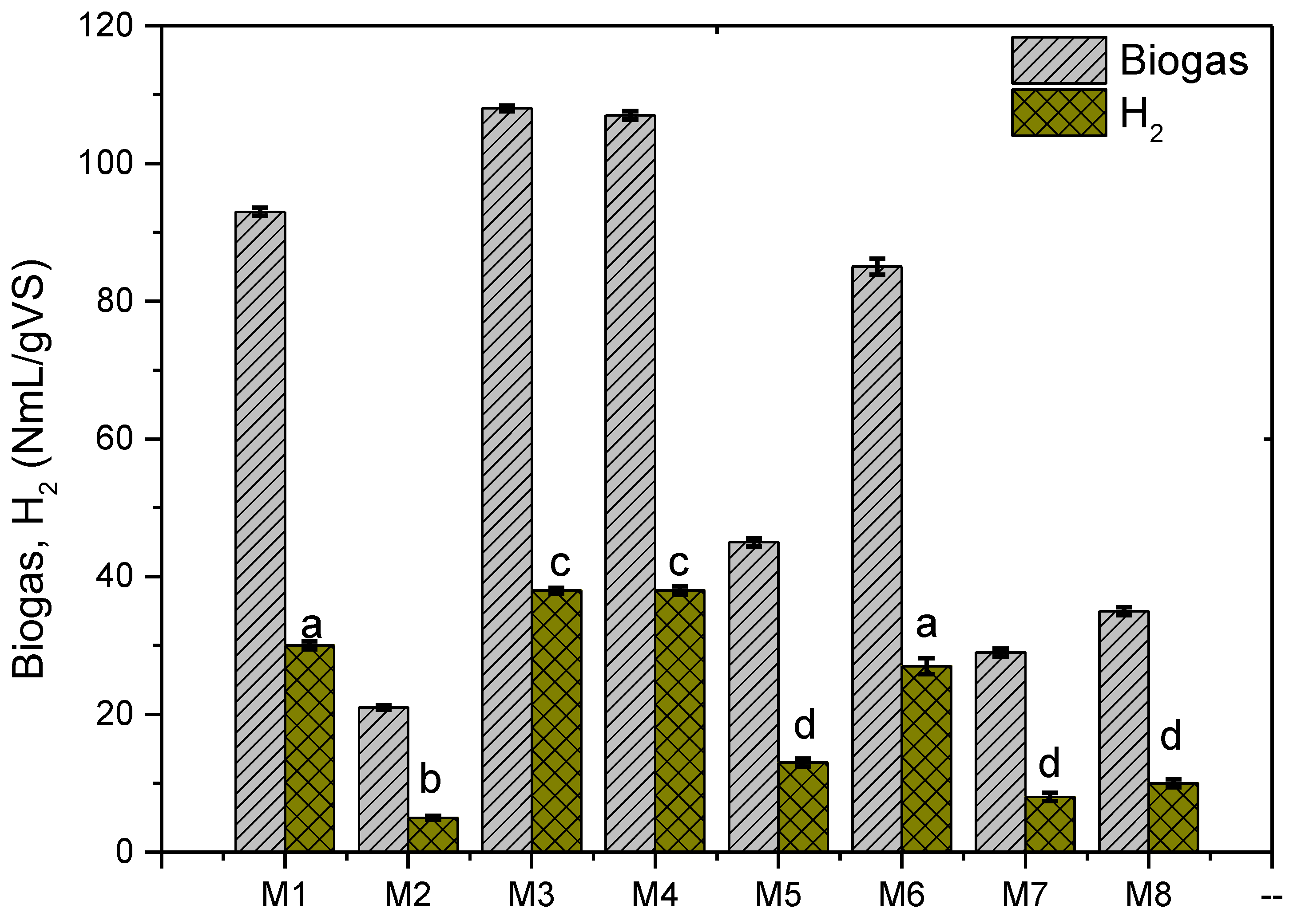 | Biohydrogen production (NmL) | 70.1 | 10.5 | 86.8 | 88.2 | 29.9 | 54.7 | 17.2 | 23.1 | |