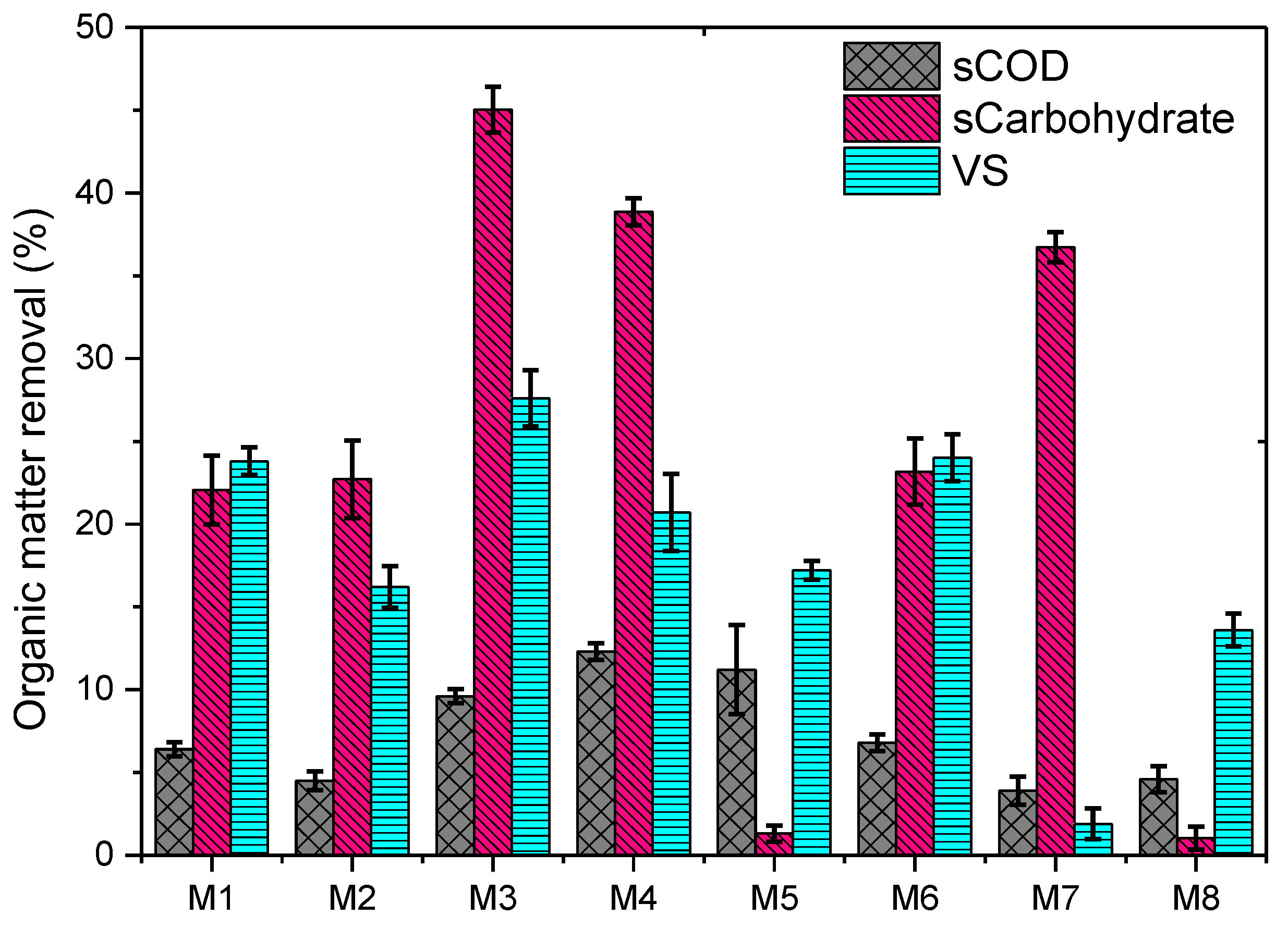 | sCOD removal (%) | 6.4 | 4.5 | 9.6 | 12.3 | 11.2 | 6.8 | 3.9 | 4.6 | |