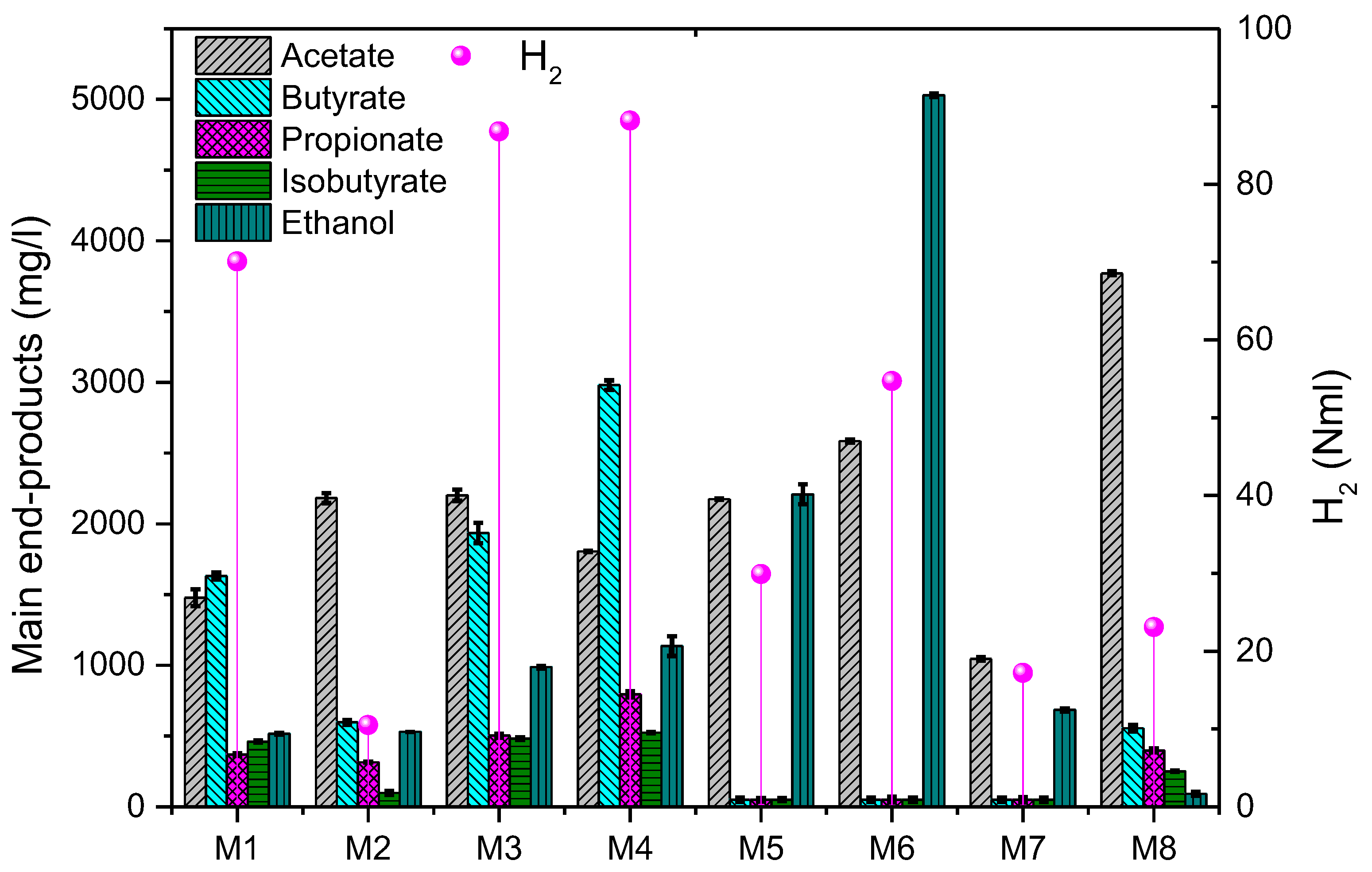 | H2 yield (NmL/gVS) | 30.0 | 5.0 | 38.0 | 38.0 | 13.0 | 27.0 | 8.0 | 10.0 | |