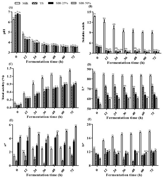 Changes in physicochemical properties of the sample according to fermentation period. (A) pH; (B) Soluble solids; (C) Total acidity; (D) L* (lightness); (E) a* (green–red coordinate); (F) b* (blue–yellow coordinate). YS refers to yellow soybean, while SBS refers to small black soybean. Mean values ± SD (n = 3) are presented. Different uppercase letters (A, B, C, etc.) indicate time-dependent differences in the same sample, and lowercase letters (a, b, c, etc.) indicate differences in the sample compared to the same fermentation time according to Duncan’s multiple rage test (p < 0.05).