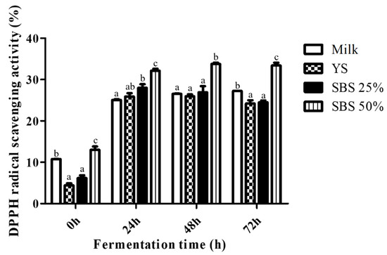 Among the plant-based fermented beverages, soybeans are the most widely used due to their high nutrient content, comparable to that of milk [24]. During fermentation, bioactive compounds such as polyphenols, tocopherols, and peptides are generated through microbial metabolism and contribute to antioxidant activity [25,26]. In this study, the fermented product containing YS and SBS exhibited antioxidant activity comparable to that of milk after 72 h, while SBS 50% demonstrated the greatest improvement.