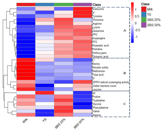 The relationships among physicochemical properties, amino acid composition, and antioxidant activity of samples were visualized using a heatmap. Data were normalized using Z-score standardization to eliminate differences in scale among variables. The heatmap was generated using the pheatmap package in R software (version 4.2.2; R Foundation for Statistical Computing, Vienna, Austra). The color gradient was set from red (high value) to blue (low value), indicating relative abundance or activity levels. Cluster groups of metabolites and physicochemical parameters were manually divided into three groups (A, B, and C) according to the dendrogram results. The sample classes were labeled as milk, YS, SBS 25%, and SBS 50%, representing different substitution ratios of soybean sprout extract.