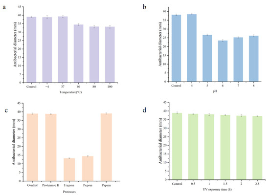 (a–d) investigate the effects of temperature, pH, protease, and UV irradiation on the antibacterial activity of FC, respectively.