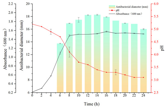 L. fermentum z-6 was revived in MRS broth and cultured at 37 °C for 24 h until OD600 ≈ 0.5 to prepare a starter culture. This culture was inoculated at 2% (v/v) into 100 mL of MRS broth and incubated at 37 °C with shaking. Samples were taken every 2 h for 24 h. At each interval, 200 μL of culture was collected for OD600 and pH measurement, and 1 mL was taken to prepare supernatant for antibacterial activity assessment.