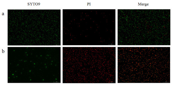 Fluorescence microscopy was used to analyze Salmonella enterica serovar Typhimurium ATCC 14028 following treatment with FC. As shown in the micrographs, untreated control bacteria (a) were compared against those treated with FC for 1.5 h (b). Subsequent dual staining with SYTO 9 and propidium iodide (PI) revealed distinct fluorescence patterns: SYTO 9 (green, left panels) and PI (red, middle panels), with the corresponding merged images displayed on the right.