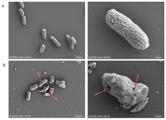 Scanning electron microscopy (SEM) analysis confirmed the significant bactericidal effects of FC on Salmonella enterica serovar Typhimurium. (a) Negative control (PBS-treated for 2 h) showed intact cellular morphology; (b) FC treatment 2 h induced characteristic membrane damage, including pore formation, structural collapse, and morphological deformation (All images represent multi-angle observations of the same sample, The arrow points to the rupture site on the bacterium).