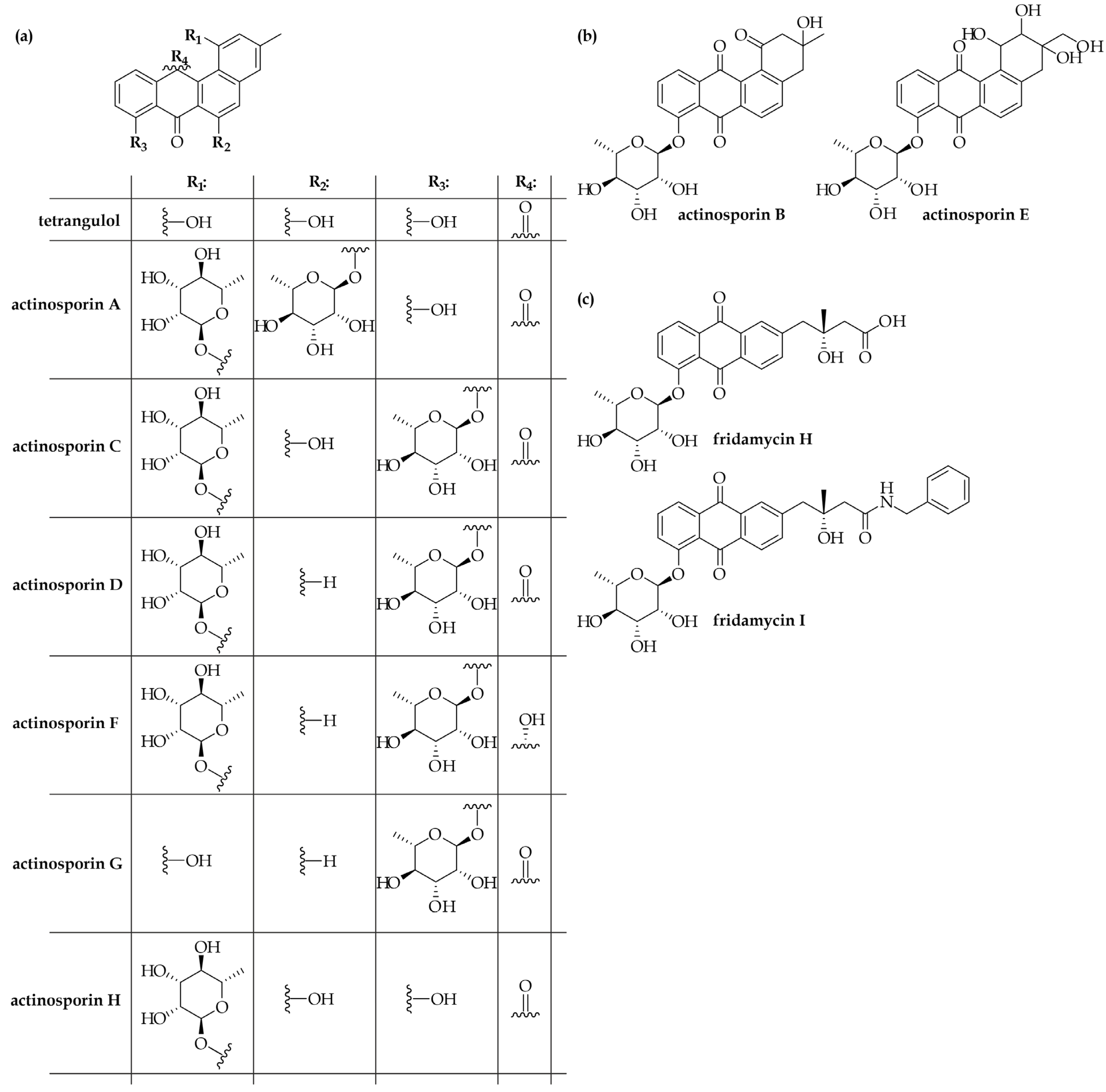 - Gerber, N.N.; Lechevalier, M.P. Novel benzo[α]naphthacene quinones from an actinomycete, Frankia G-2 (ORS 020604). Can. J. Chem. 1984, 62, 2818–2821. [Google Scholar] [CrossRef]
