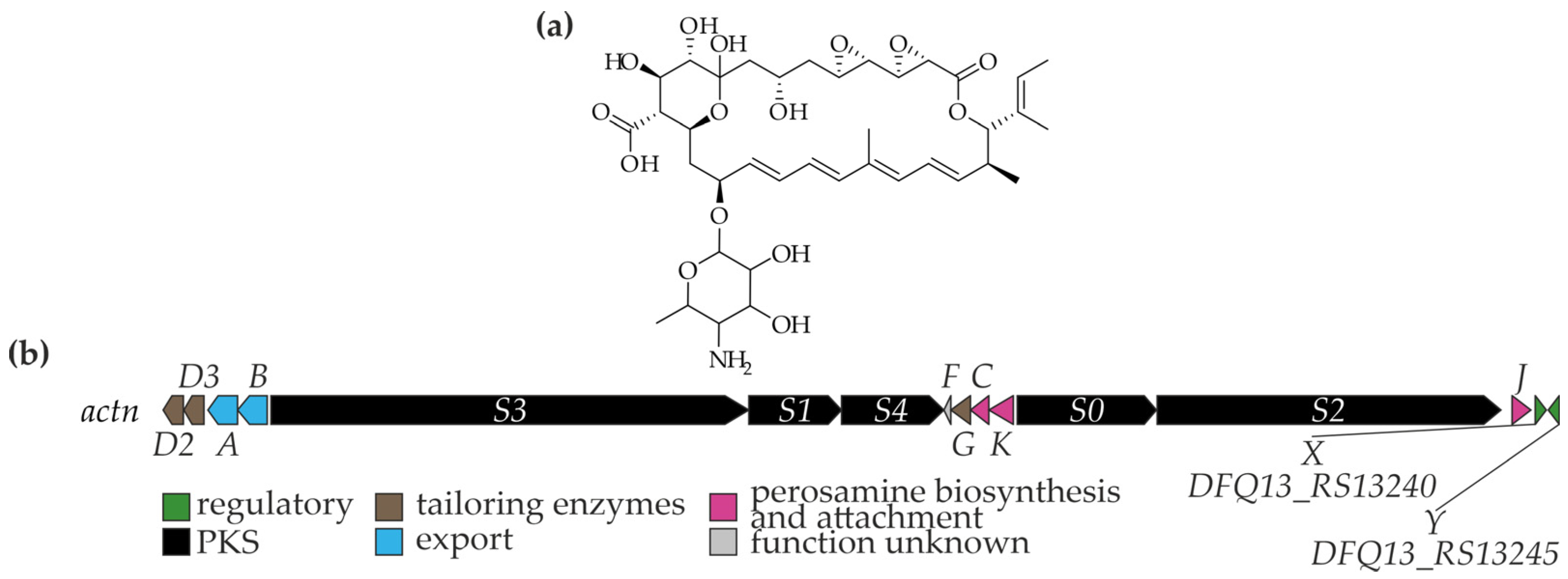 - Aparicio, J.F.; Caffrey, P.; Gil, J.A.; Zotchev, S.B. Polyene antibiotic biosynthesis gene clusters. Appl. Microbiol. Biotechnol. 2003, 61, 179–188. [Google Scholar] [CrossRef]