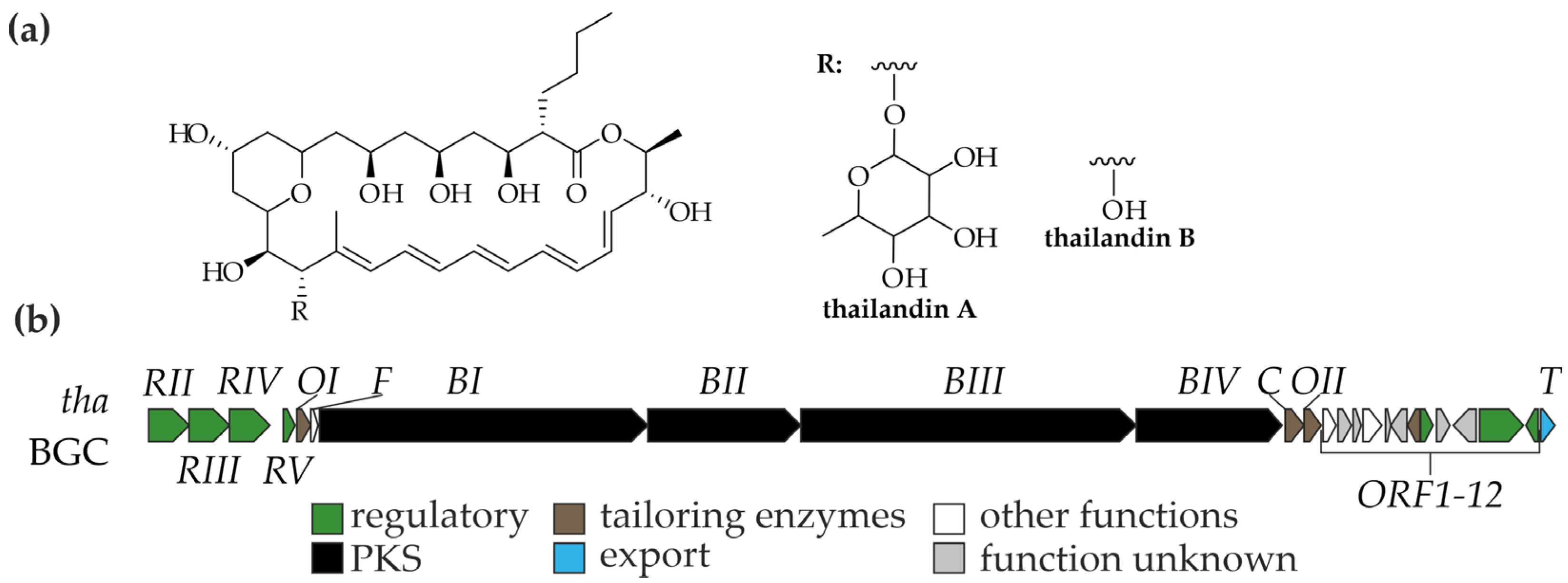 - Intra, B.; Greule, A.; Bechthold, A.; Euanorasetr, J.; Paululat, T.; Panbangred, W. Thailandins A and B, New polyene macrolactone compounds isolated from Actinokineospora bangkokensis strain 44EHWT, possessing antifungal activity against anthracnose fungi and pathogenic yeasts. J. Agric. Food Chem. 2016, 64, 5171–5179. [Google Scholar] [CrossRef]
