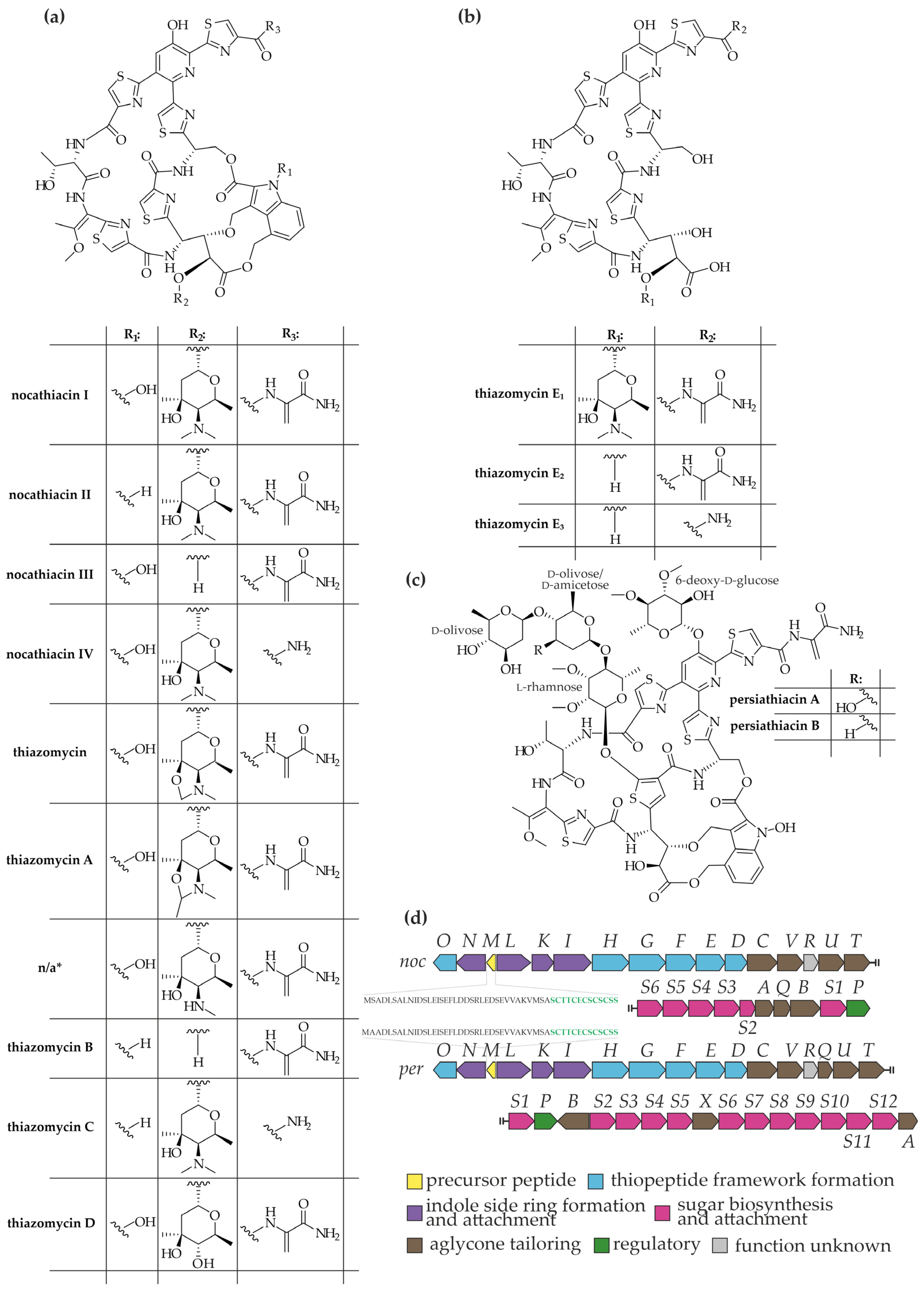 - Just-Baringo, X.; Albericio, F.; Álvarez, M. Thiopeptide antibiotics: Retrospective and recent advances. Mar. Drugs 2014, 12, 317–351. [Google Scholar] [CrossRef] [PubMed]