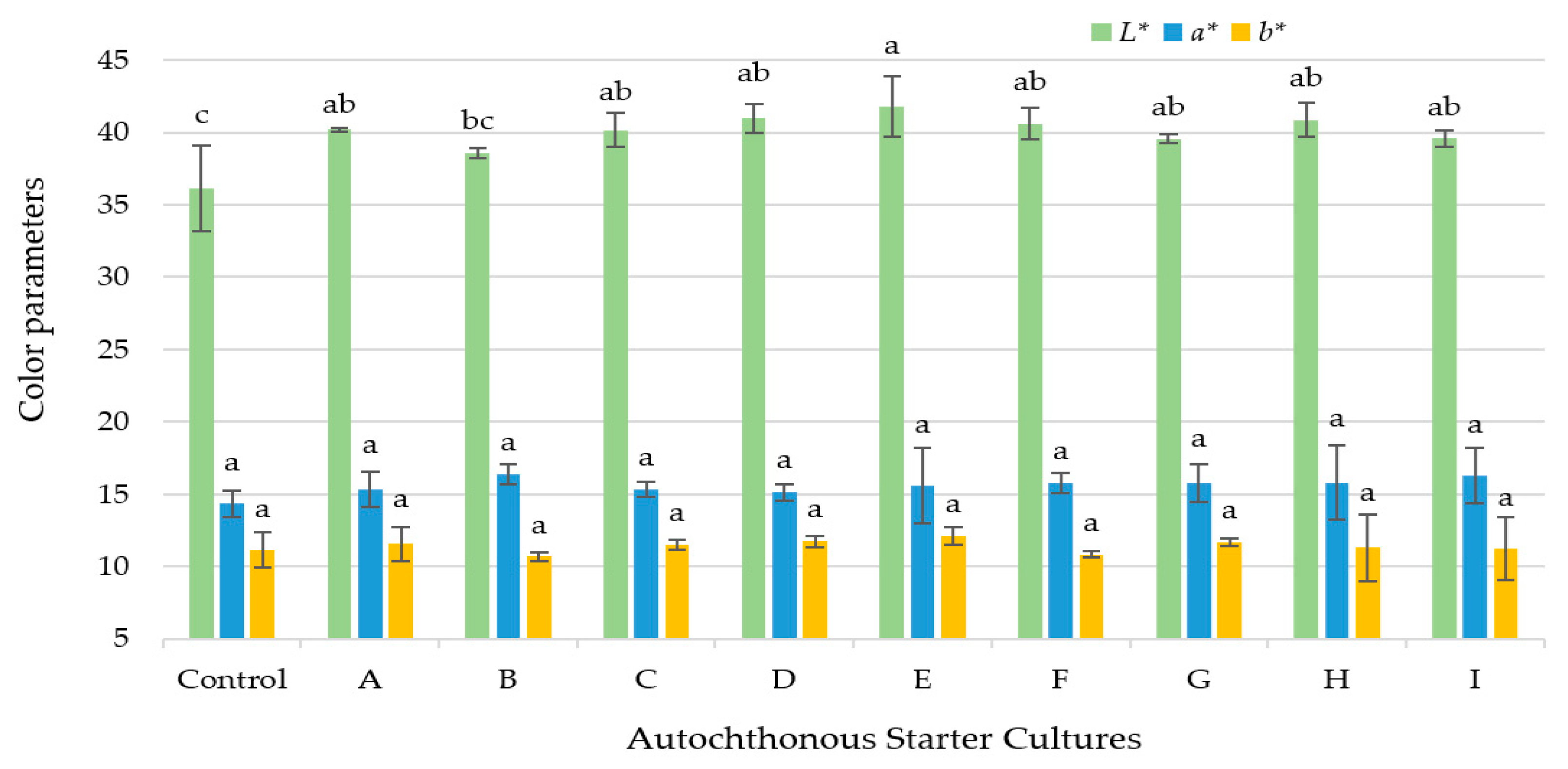 - Kargozari, M.; Moini, S.; Basti, A.A.; Emam-Djomeh, Z.; Gandomi, H.; Martin, I.R.; Ghasemlou, M.; Carbonell-Barrachina, Á.A. Effect of autochthonous starter cultures isolated from Siahmazgi cheese on physicochemical, microbiological and volatile compound profiles and sensorial attributes of sucuk, a Turkish dry-fermented sausage. Meat Sci. 2014, 97, 104–114. [Google Scholar] [CrossRef]