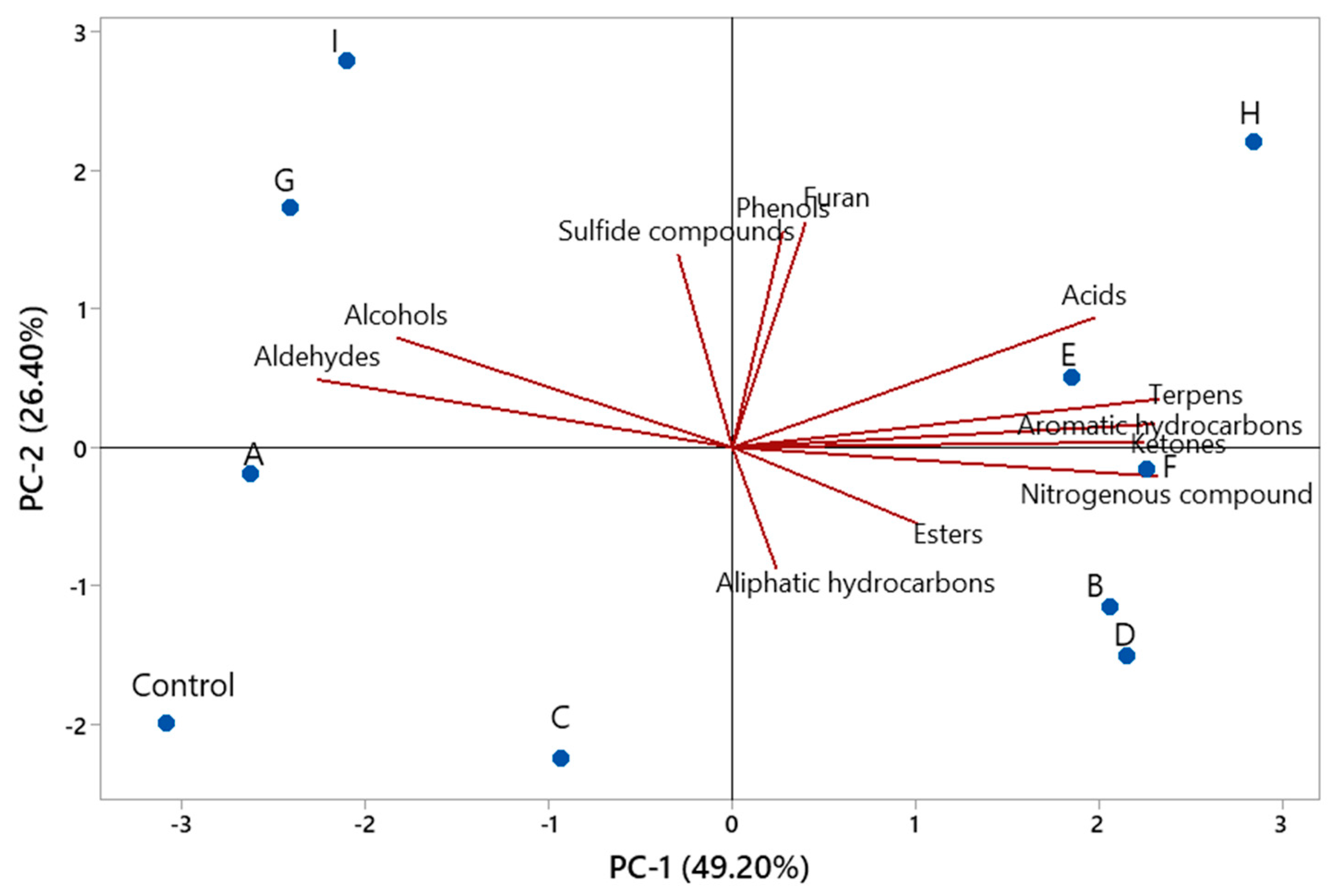 | Identified Compounds | KI | RI | Control | A | B | C | D | E | F | G | H | I | Sig. |