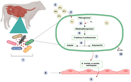 A schematic illustrating the pathways involved in the degradation of phloroglucinol, highlighting the redirection of excess dihydrogen (H2) by phloroglucinol-utilizing bacteria during the inhibition of methanogenesis in the rumen. (1) Microbial degradation of phloroglucinol by bacteria in the rumen. (2) Increased concentrations of dissolved dihydrogen (dH2) during the inhibition of methanogenesis. (3) Capture of excess dihydrogen (H2) for the reduction of phloroglucinol by ruminal bacteria. (4) Reduction of phloroglucinol to dihydrophloroglucinol using incorporated dihydrogen (H2) as an electron donor, catalyzed by NADPH-dependent short-chain dehydrogenases/reductases. (5) Hydrolysis of dihydrophloroglucinol to 3-hydroxy-5-oxohexanoate. (6) Conversion of 3-hydroxy-5-oxohexanoate primarily results in acetate and carbon dioxide (CO2) production when degraded by Coprococcus spp., or acetate and butyrate when degraded by Eubacterium oxidoreducens. (7) Increased acetate or acetate and butyrate production. (8) Rumen wall. (9) Absorption of acetate or acetate and butyrate through the rumen wall. (10) Increased carbon dioxide (CO2) production. Created in BioRender: Ahmad, I. (2025) https://BioRender.com/cfd68sv.