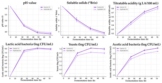 It should be noted that the present microbiological analysis quantified only the total populations of lactic acid bacteria, yeasts, and acetic acid bacteria, without identifying the dominant species or their succession patterns. These counts are sufficient to describe overall fermentation performance and to compare the effect of hydrolate addition, but the lack of species-level resolution limits the ability to attribute specific biochemical changes, such as organic acid dynamics or volatile formation, to particular microbial taxa.