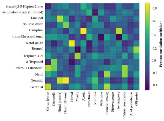 To investigate the relationship between the volatile profile of the lemon catnip hydrolate and the sensory characteristics of the tibicos beverages, a multivariate correlation analysis was performed. A set of 14 volatile compounds identified by GC–MS (6-methyl-5-hepten-2-one, cis-linalool oxide, linalool, cis-rose oxide, camphor, trans-chrysanthemal, nerol oxide, borneol, terpinen-4-ol, α-terpineol, nerol + citronellol, neral, geraniol and geranial) were compared with the 16 QDA sensory attributes, organized into aroma (citrus–lemon, citronella, floral aroma, herbal, yeasty, acetic, off-notes), flavor (sweetness, sourness, bitterness, citrus flavor, floral flavor) and mouthfeel/aftertaste descriptors (effervescence, astringency, citrus persistence, acid persistence). Volatile compound peak areas were standardized prior to analysis, and sensory attribute scores were averaged across panelists. Pearson correlation coefficients were then calculated for all volatile–sensory pairs, resulting in a 14 × 16 correlation matrix. The matrix was visualized as a heatmap generated using Python (Matplotlib, version 3.10.7.), with color intensity representing the strength and direction of correlations.