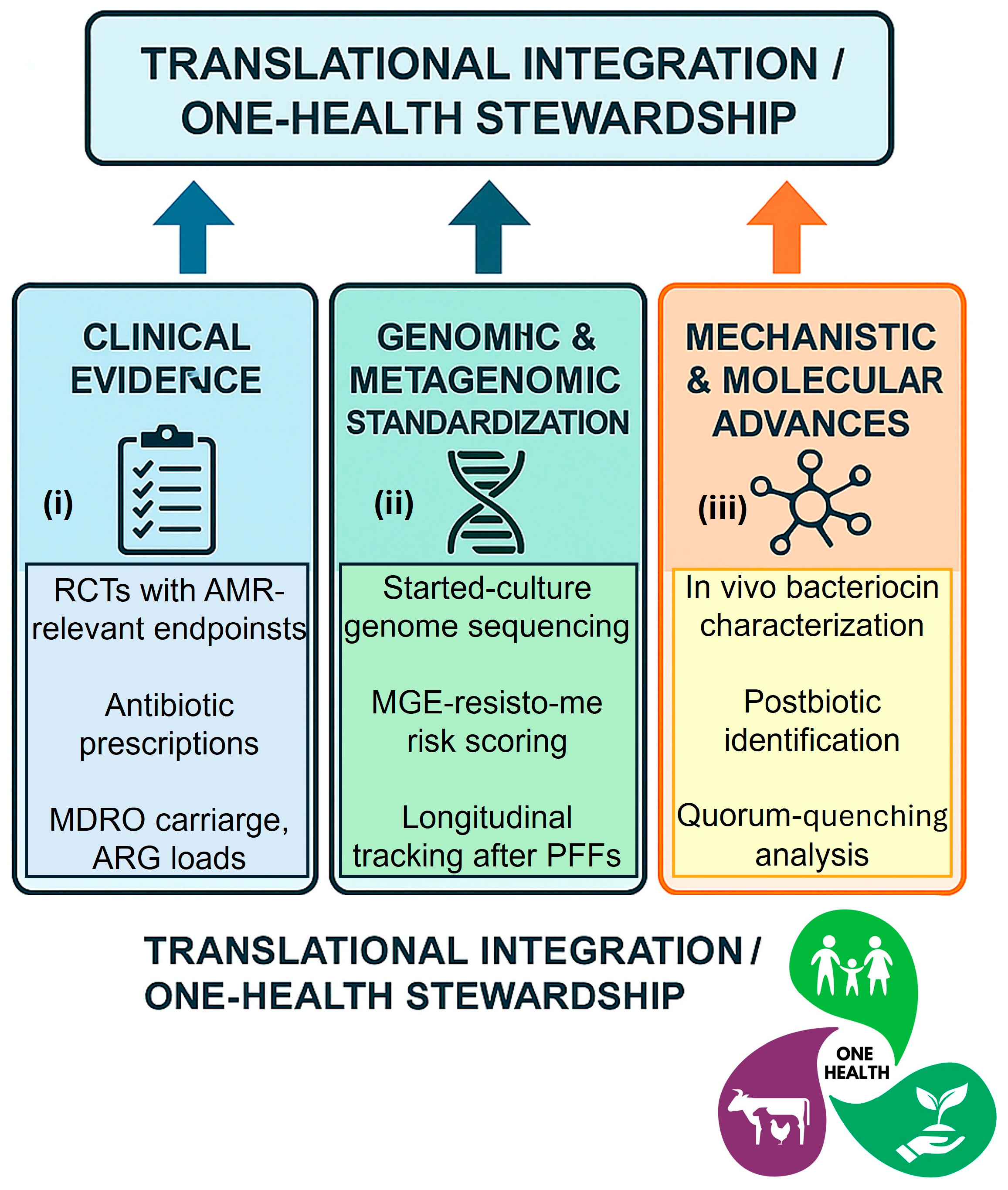 - Clinical validation: Designing multicenter randomized controlled trials (RCTs) with AMR-relevant endpoints, such as antibiotic-prescription frequency, multidrug-resistant organism (MDRO) carriage, and antimicrobial-resistance gene (ARG) load in stool samples.