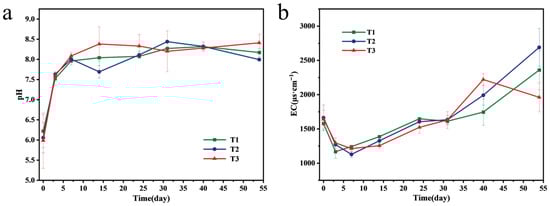 The pH characterizes the acidity and alkalinity of the composting environment, and its change can change the cell membrane charge of microorganisms, affecting nutrient absorption and the degradation of organic matter [3,24]. Therefore, pH is an important parameter affecting microbial activity and the composting process. Figure 2a shows the pH change curve for each treatment. The pH of each treatment showed a significant upward trend in the first week and finally stabilized at 7.5–8.5. The increase in pH was due to rising temperature, rapid degradation of organic acids during the heating stage, and the decomposition of nitrogen-containing organic matter such as proteins. Among them, the maximum increment was found in the T3 treatment, which was 40.52% higher than the initial mixed sample, indicating that the addition of 3 cm branches was beneficial to the activity of microorganisms, thus accelerating the mineralization decomposition process. In the later composting stage, the activity of nitrifying bacteria increased, releasing H+ due to alkalinity and stabilizing pH. At the end of composting, the pH of the T3 group was higher than that of the other two groups, which may be attributed to the addition of 3 cm branches. These branches increased porosity of the composting system and promoted more complete decomposition of organic nitrogen, generating more ammonia and stronger alkalinity. At the end of composting, the final pH values of T1, T2, and T3 treatments were 8.17, 8.00, and 8.41, respectively, all within the optimum composting pH range of 6.7–9.0 [25].