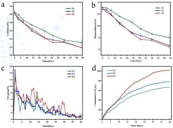 Variations in cellulose (a), hemicellulose (b), and CO2 emissions (c,d) during composting.