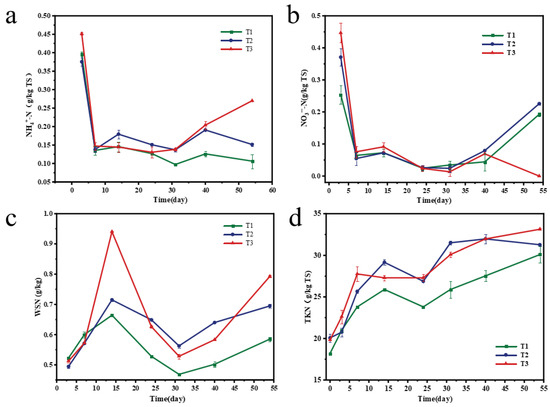 NH4+-N (a), NO3−-N (b), water-soluble nitrogen (WSN) (c), and total Kjeldahl nitrogen (TKN) (d) during the composting process.