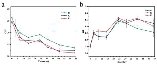 C/N is one of the key indicators used to test whether the compost is mature or not. It is generally believed that when C/N < 20, the maturity standard is reached [42]. After the start of composting, the decrease in organic carbon content and the increase in total nitrogen content led to the gradual decrease in C/N, with the T3 group being preferentially reduced to below 20 first. The C/N of T1, T2, and T3 treatments decreased from 26.29, 24.15, and 24.80 to 13.52, 12.49, and 11.42, respectively. From Figure 5a, it can be seen that by the end of composting, the C/N of each treatment was less than 20, reaching the maturity requirement.