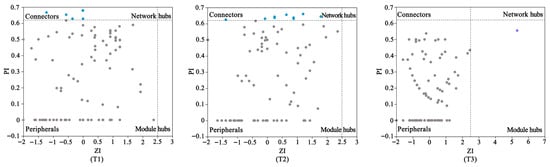 Zi-Pi analysis retained ASVs with relative abundance greater than 0.001%, Spearman correlation ≥ 0.6, and p < 0.05 in at least six samples. As shown in Figure 8, according to differences in within-module connectivity (Zi) and among-module connectivity (Pi), nodes were divided into four categories: peripherals (Zi < 2.5 and Pi < 0.62), connectors (Zi < 2.5 and Pi > 0.62), network hubs (Zi > 2.5 and Pi > 0.62), and module hubs (Zi > 2.5 and Pi < 0.62) [55]. In this study, most of the nodes in each network were peripherals (>93.15%). It was determined that T1 contained five kinds of connectors, T2 contained ten kinds of connectors, and T3 contained one module hub, with the rest being peripherals. Among them, ASV2 belongs to Aspergillus, ASV48 and ASV59 belong to Xanthomonas, and ASV80 belongs to Pseudomonas. By comparison, T2 contained a higher proportion of key species, indicating that T2 played a key role in maintaining the stability of the symbiotic network.