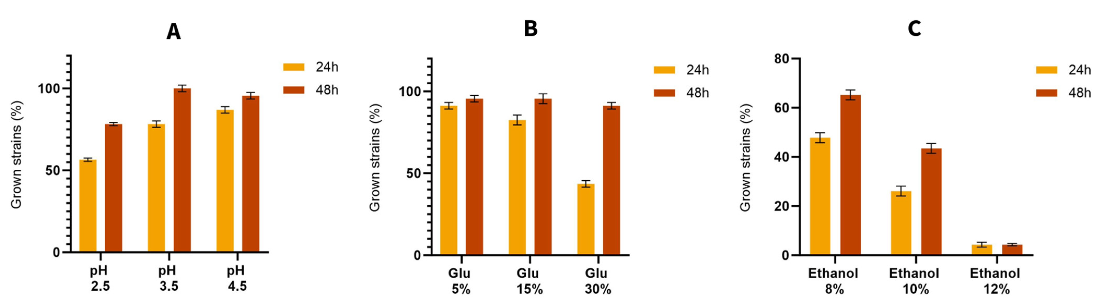 - Ivorra, C.; Pérez-Ortín, J.E.; del Olmo, M. An Inverse Correlation between Stress Resistance and Stuck Fermentations in Wine Yeasts. A Molecular Study. Biotechnol. Bioeng. 1999, 64, 698–708. [Google Scholar] [CrossRef]