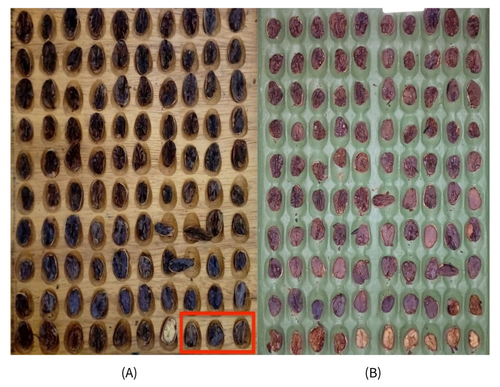 | Fermentation-Related | Higher % of compartmentation (white/brown almonds) and well-fermented almonds (70.3%) | Higher % of flat white, partially/sub-fermented almonds; fermentation index (85.1%) |