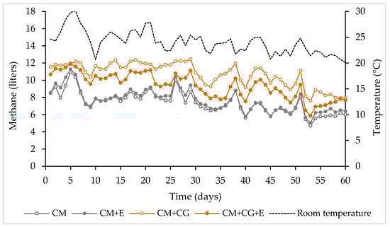 Variation in daily biogas production and temperature during the experimental period. CM: 100% CM without enzyme; CM + E: 100% CM with enzyme; CM + CG: 70% CM and 30% CG without enzyme; and CM + CG + E: 70% CM and 30% CG with enzyme.