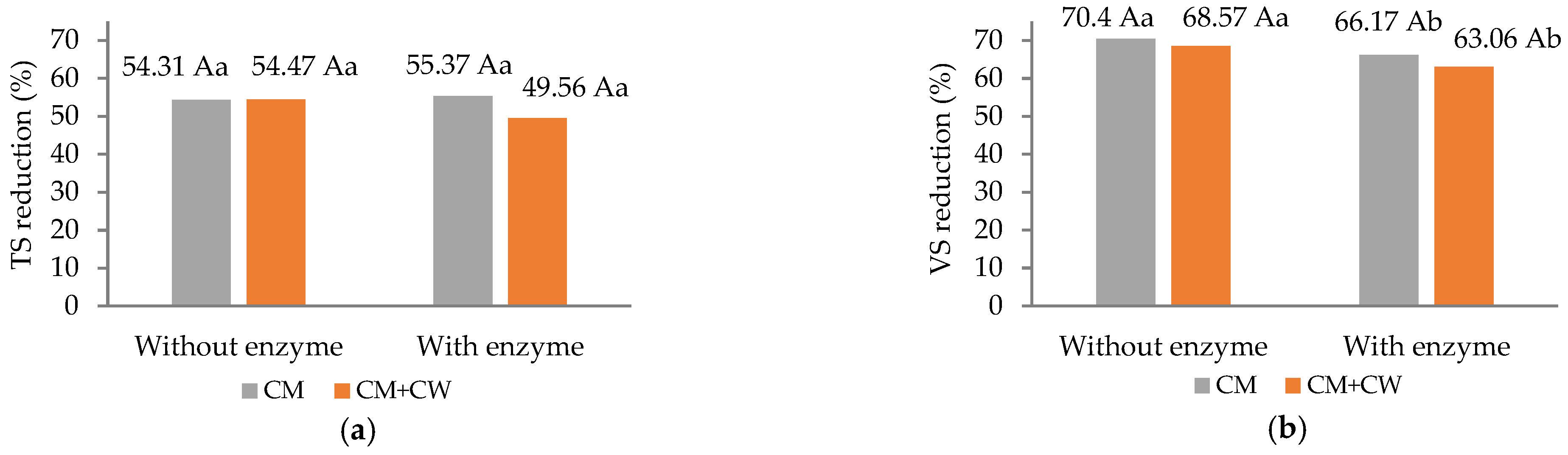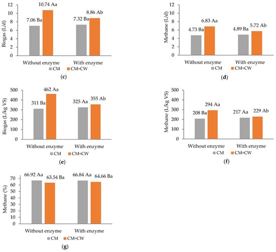 Total solids reduction (a), volatile solids reduction (b), daily biogas production (c), daily methane production (d), specific biogas yield (e), specific methane yield and (f) methane content in biogas (g). Different capital letters represent statistical differences within the factor, without and with CG. Different lowercase letters indicate statistical differences within the factor, without and with enzymes (Tukey’s test, p < 0.05).
