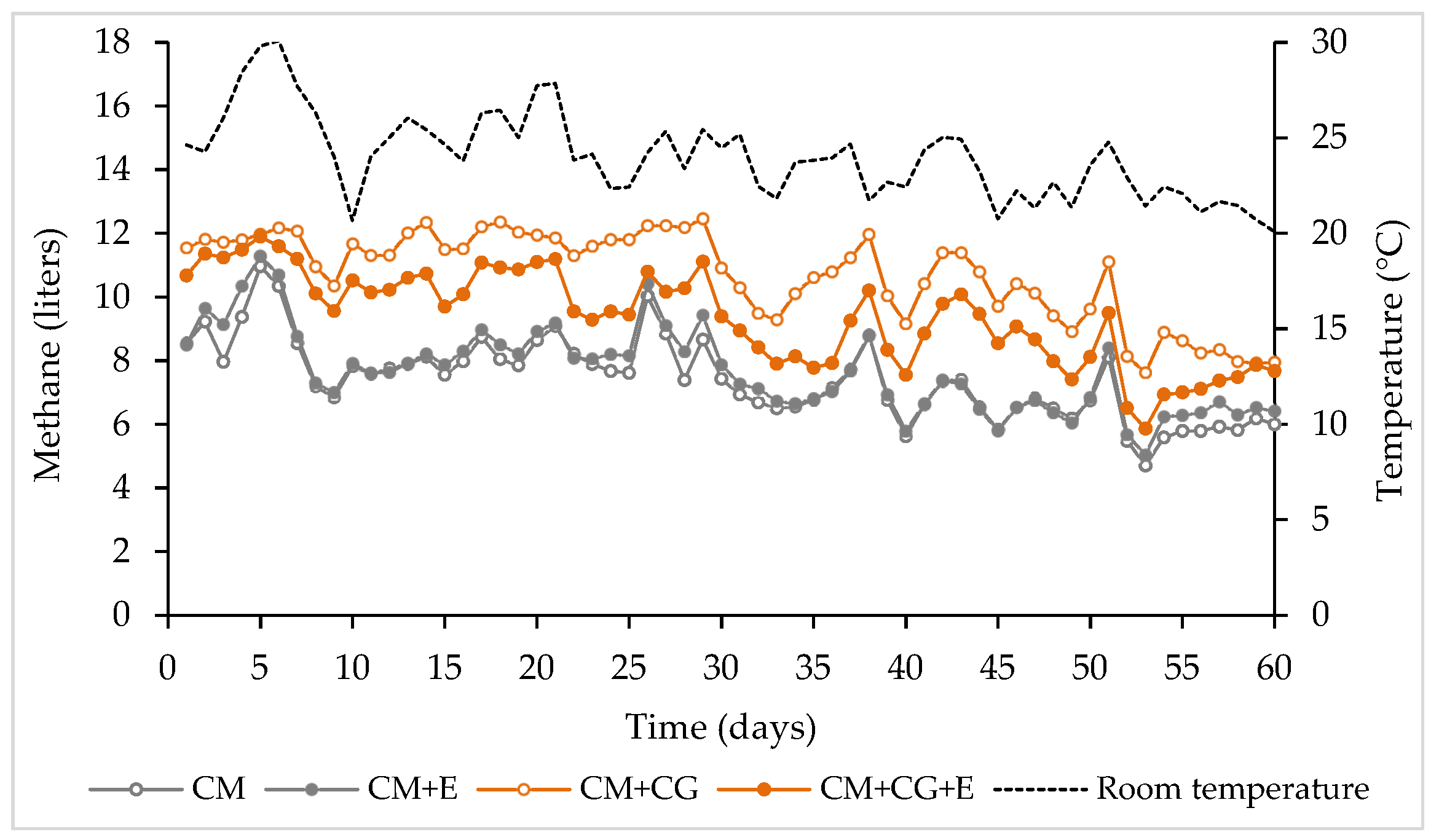 When comparing mono-digestion (CM) and co-digestion (CM + CW), the inclusion of CG had a beneficial influence, promoting higher energy recovery from the substrate, which resulted in significantly greater (p < 0.05) biogas and methane yields (L/d and L/kg VS) (Figure 3).
